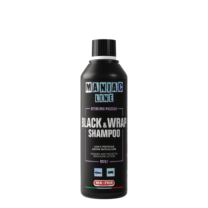 Black & Wrap Shampoo della Maniac Line™ di Mafra è il prodotto 2 in 1 ideato per auto nere, pellicolate o con PPF, che lava e protegge in un’unica operazione. Il prodotto, grazie alla sua formula ricca di minerali, permette di prevenire in maniera drastica la formazione di macchie di calcare in fase di asciugatura e, inoltre, di eliminare la patina nera data da sporco e contaminazioni.